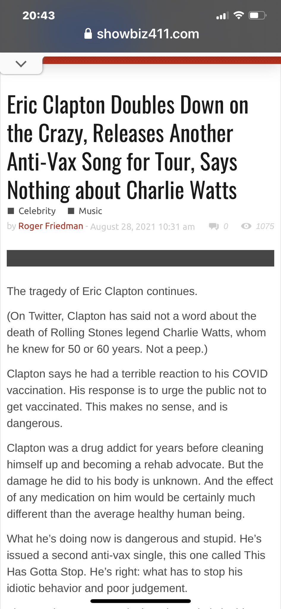 Vehement anti-vax rocker Eric Clapton has just dropped what appears to be a musical rant against pandemic restrictions and vaccines. The tragedy of Eric Clapton continues.